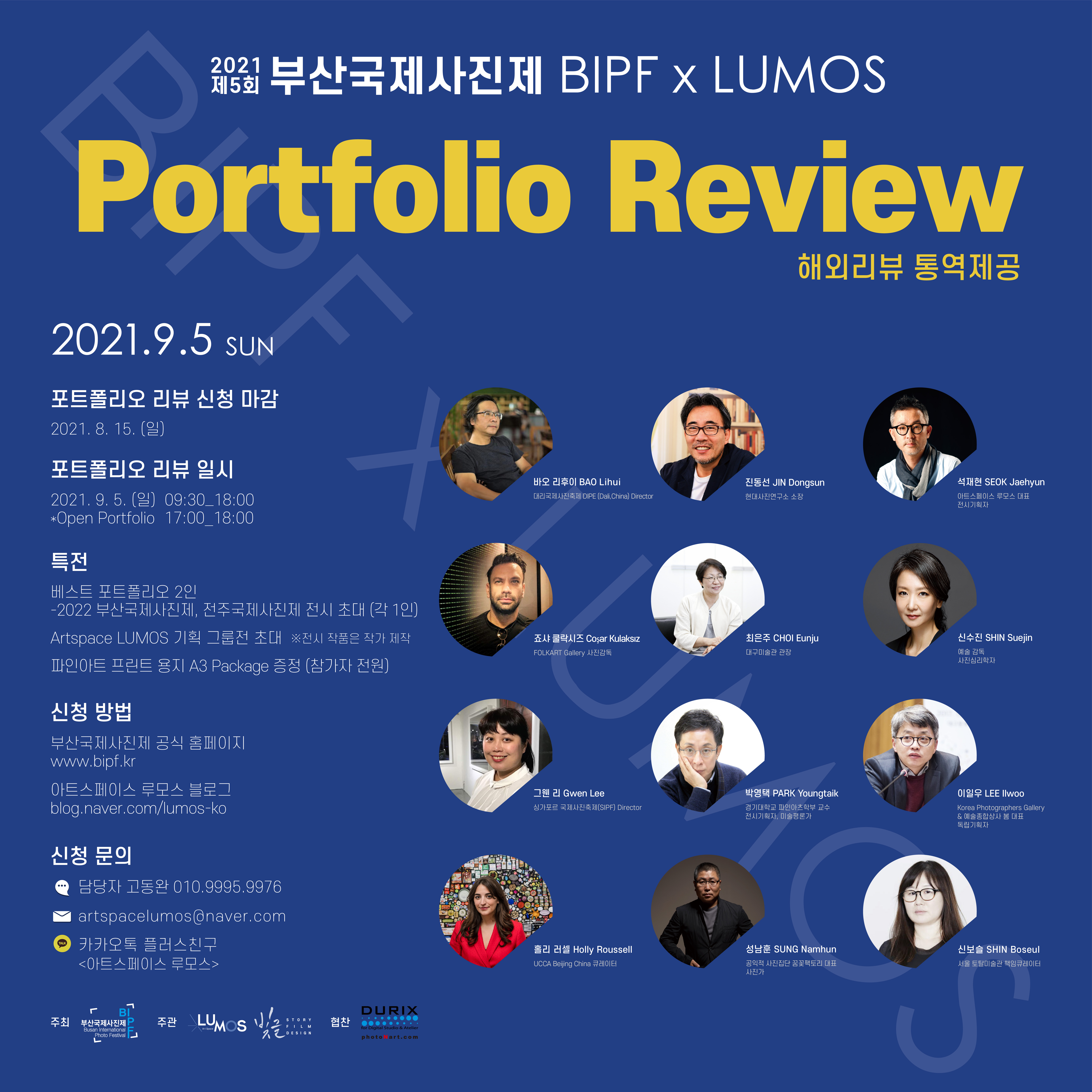 BIPF와 LUMOS가 함께하는 이번 포트폴리오 리뷰는 국내의 사진가들이 다양한 분야의 전문가들과의 소통을 통해 작업에 대한 아이디어와 피드백을 얻을 수 있는 대화의 장을 만들고. 그들이 이번 기회를 발판삼아 다양한 활동을 위한 기회와 정보를 얻고 네트워크를 조성하는 메인 행사가 될 것입니다.