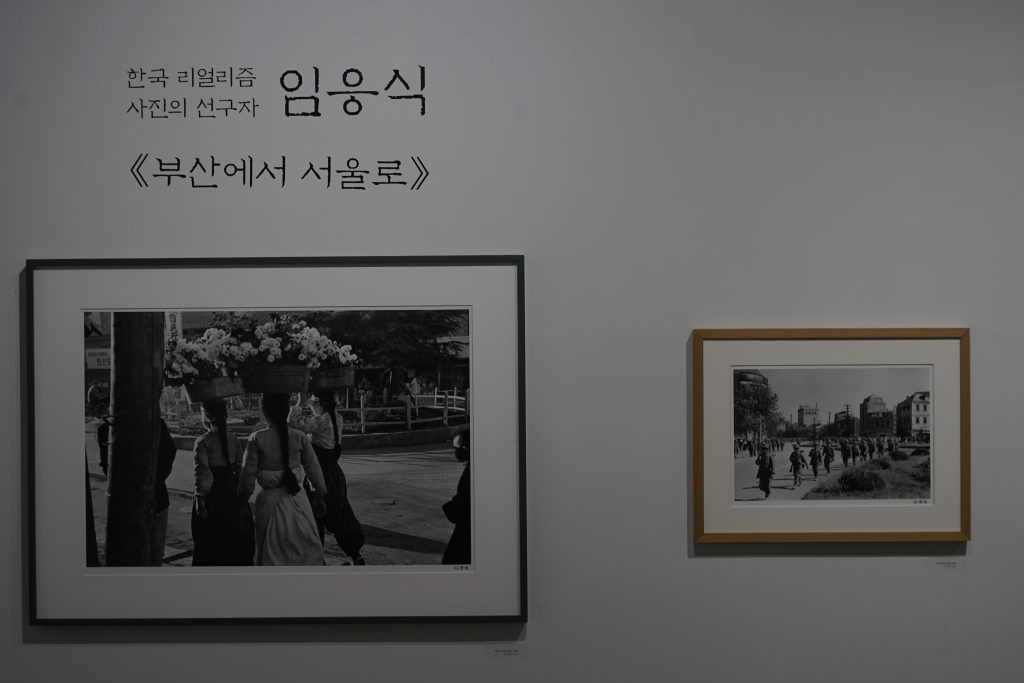 전시장 정면의 작품은 임응식이 태어난 부산을 배경으로 찍은 ‘부산 아침'(1946)으로 아침 햇살을 받으며 꽃을 이고 걷는 여성들의 뒷모습을 담은 큰 사진을 전시했다. 옆으로 나란히 배치한 작은 사진은 총을 들고 서울로 들어서는 군인들의 행렬을 담은 ‘국군입성’(1950)이다.