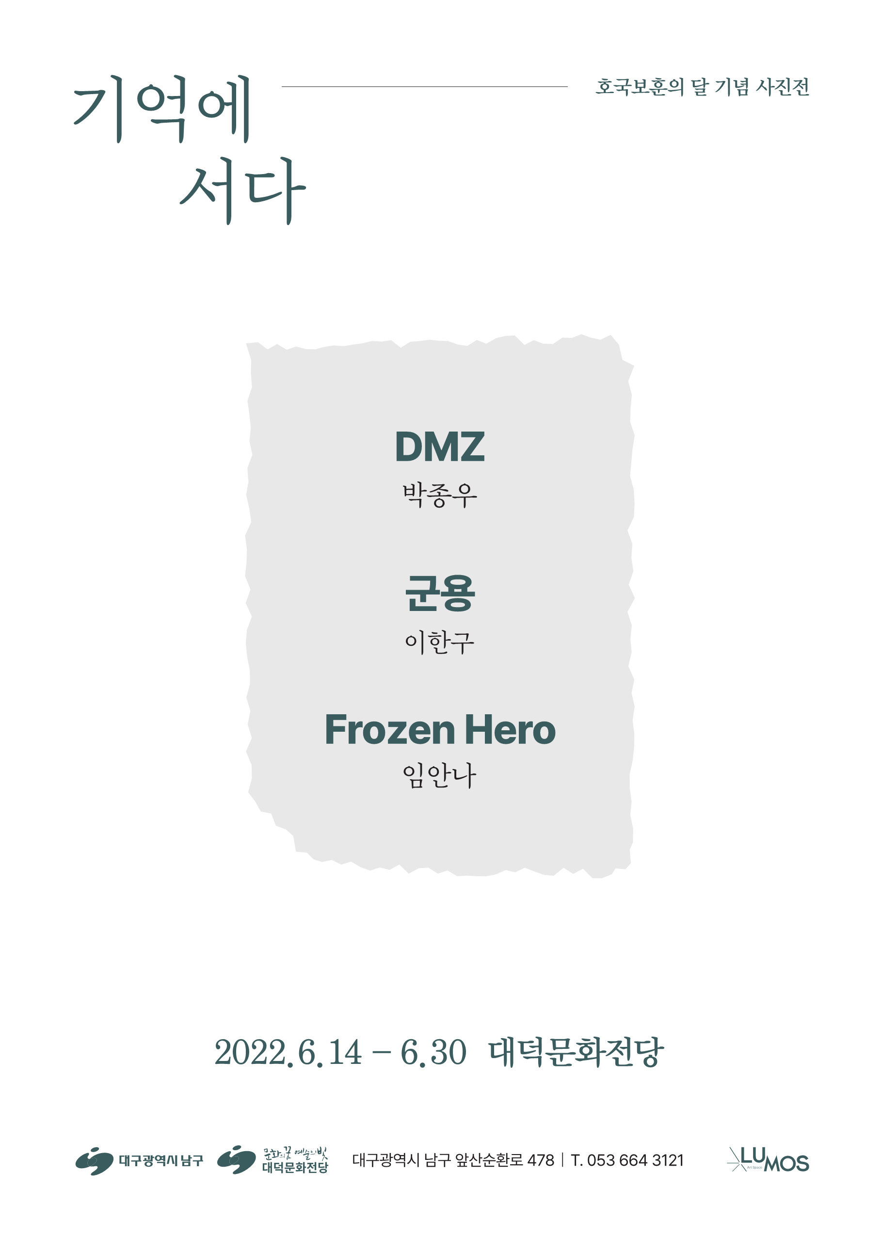 호국보훈의 달 기념 사진전 <기억에 서다> 전시에 참여하는 박종우, 이한구, 임안나 3인의 작가는 총55점(박종우 15점, 이한구 24점, 임안나 16점)의 작품을 선보인다. 그들은 각자 개성 있는 시선으로 한국이 지닌 분단의 현실과 전쟁의 모습을 기록하고 있는 사진가다. 다큐멘터리적 시선에 사진매체가 지닌 조형성, 예술성을 함께 녹여낸 작품들은 때로는 평화와 긴장 사이에 위치한 처연한 모습으로 때로는 평화로운 풍경 속 애써 외면해왔던 위태로운 평화의 현실을 ‘기억’으로 전한다.