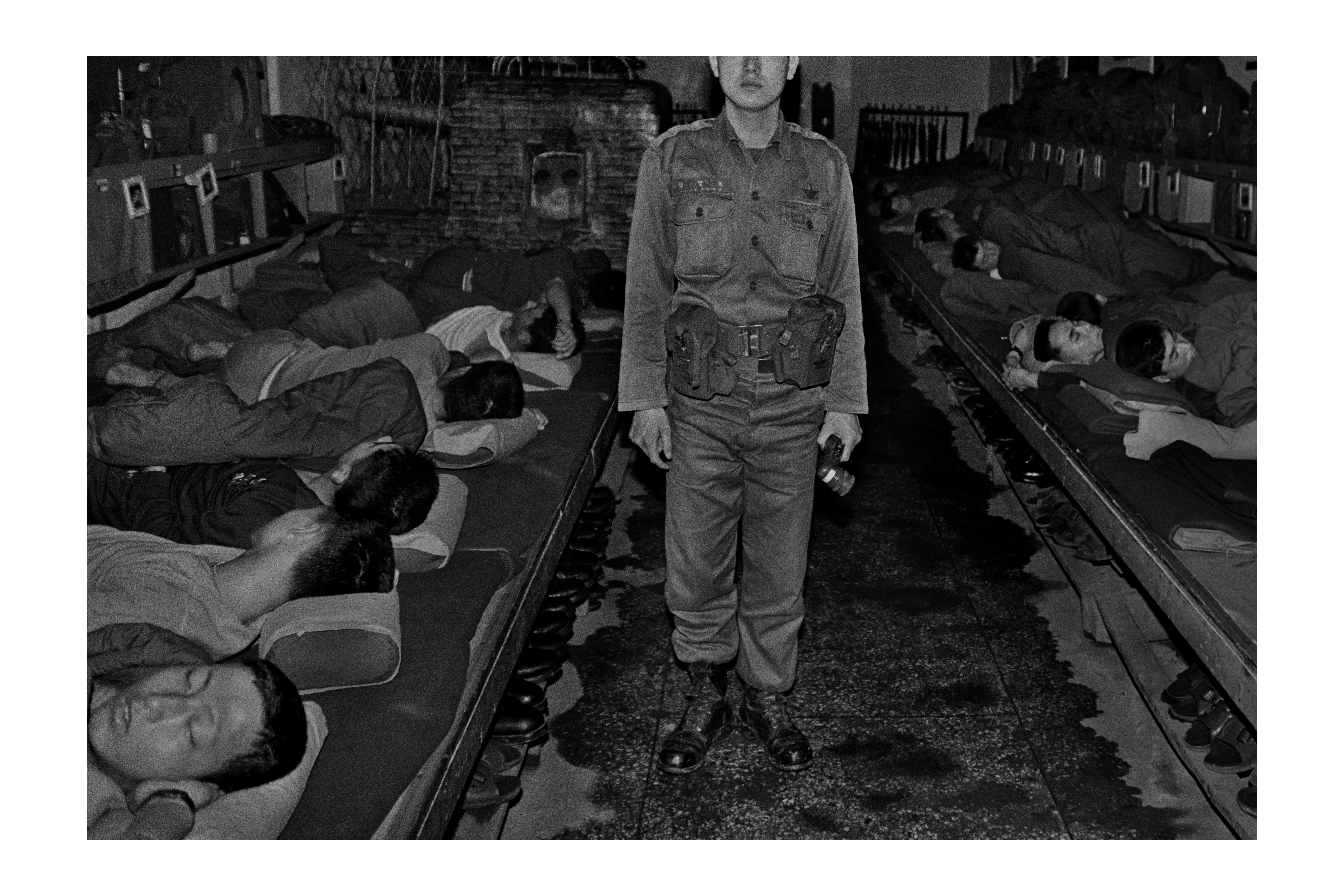 이한구 사진가의 <군용>은 자신이 군인이던 1989년 11월부터 촬영한 작품들이다. ‘어차피 군대에 간다면 최전방에서 사진을 찍고 싶다’는 생각에 최전방 근무를 지원한 그는 국방의 의무를 수행하며 사진을 촬영했다. 반바지만 입은 채 연병장을 ‘구르고’ 있는 장병들, 점심을 먹고 나란히 침상에 누워 있는 이들은 누가 누구인지 구별할 수 없을 정도이다. 획일적인 삶이 생존의 법칙이 되어버린 군대의 일상, 나라를 지키기 위한 젊은 청춘들의 모습이 애처롭다.