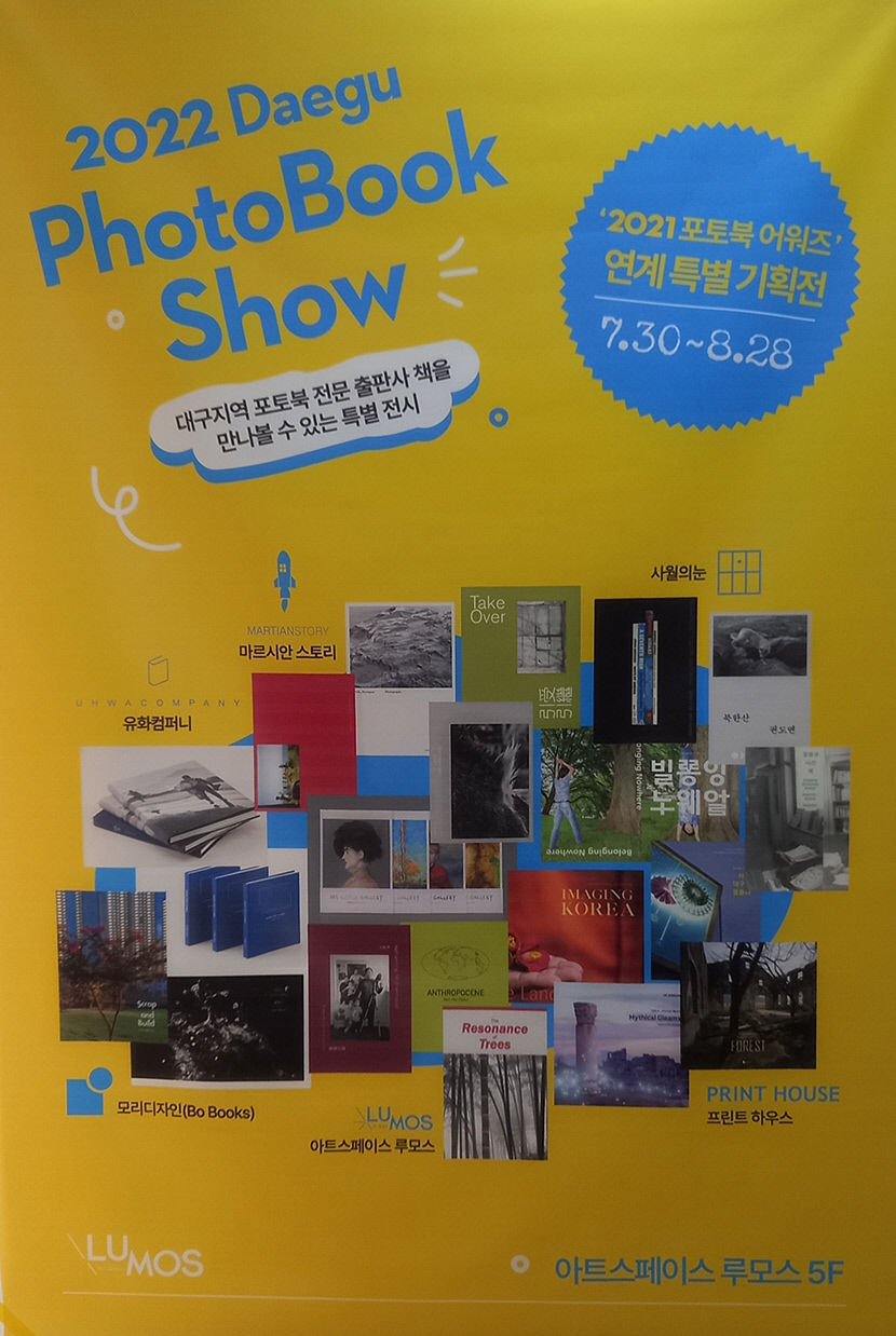 행사명은 ‘The Paris Photo–Aperture Foundation PhotoBook Awards 대구에디션’: 일명 ‘2022 대구 포토북 쇼’이다. 이 상은 두 사진 전문단체인 Paris Photo와 Aperture Foundation이 협업하여 2012년부터 매년 3가지 부문에서 우수 포토북들을 선정해오고 있다. 후보로 선정된 작품집들은 파리 그랑 팔레에서 개최되는 Paris Photo 전시를 시작으로 전세계 주요 도시에서 순회 전시로 소개되고 있다. 2021년에는 출품된 800여권의 중 선정된 38권의 포토북지 전시는 아시아 투어 일환으로 서울 한미사진미술관, 대구 아트스페이스 루모스에서 차례로 열렸다. 두 기관의 의기투합으로 한국 사진계에 포토북의 바람을 일으킨 셈이다.
