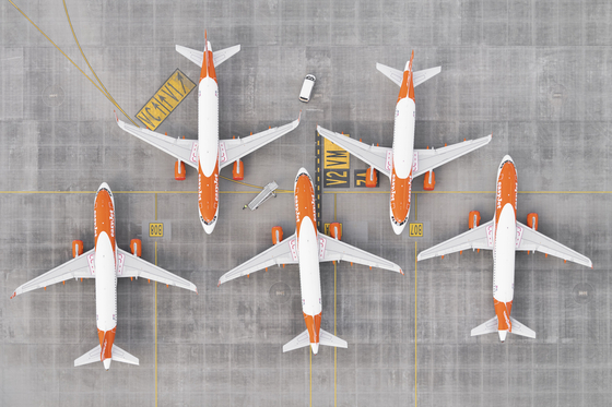 예쁘게 그린 일러스트레이션 작품과 마주한 느낌이다. 화사한 오렌지색 비행기가 지그재그 형태로 도열해 있고 아스팔트 바닥의 선명한 선들도 시선을 집중시킨다. 그리고 아주 작게 보이지만 이동식 계단을 밀고 가는 사람까지. 질서정연한 구조적 아름다움에 빠져들다 문득, 무언가 비정상적임을 깨닫는다. 여기가 어딘가. 보안이 철저하고 일반인의 접근이 거의 불가능한 공항 계류장이 아닌가. 그런데 이곳의 비행기들을 그것도 하늘 위에서 촬영한다는 건 누가 봐도 어불성설이다.