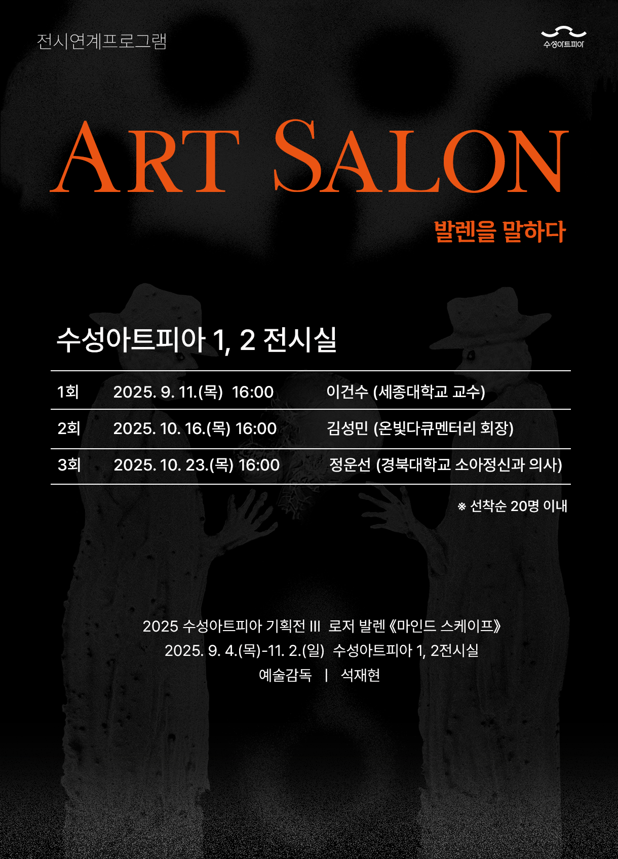 그 외 연계 프로그램으로 세종대학교 이건수 교수님, 온빛다큐멘터리 김성민 회장님, 그리고 경북대학교 소아정신과 정운선 교수님께서 로저 발렌의 작품에 대해 이야기하는 시간도 준비되어 있습니다.