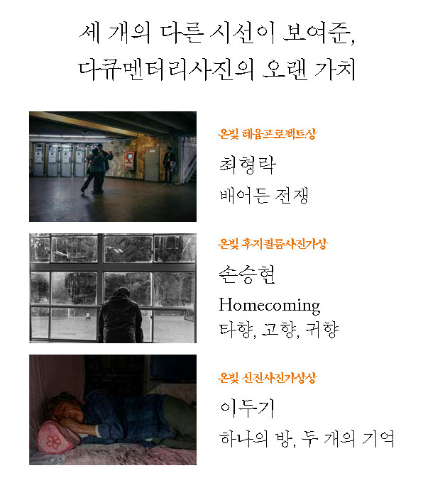 이번 선정된 온빛다큐멘터리 수상작은 최형락의 ‘배어든 전쟁’, 손승현의 ‘Homecoming : 타향, 고향, 귀향’과이두기의 ‘하나의 방, 두 개의 기억’으로 갤러리 혜윰, 류가헌, 갤러리 탄에 이어 8월 18일(금)부터 9월 3일(일)까지 전시를 개최합니다.