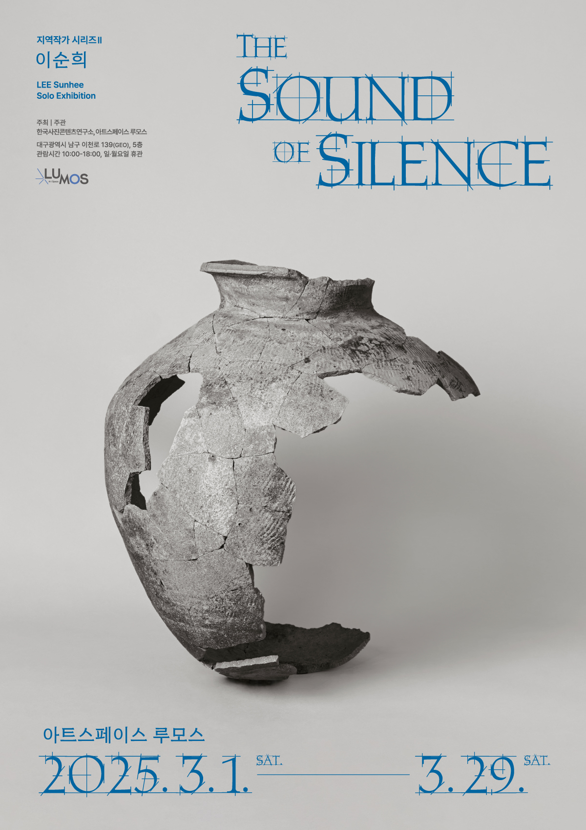 2025년 3월 1일부터 3월 29일까지 한국사진콘텐츠연구소와 아트스페이스루모스에서 주최 주관하는 두 번째 지역작가 시리즈 <The Sound of Silence> 이순희 사진전이 아트스페이스 루모스에서 열린다.