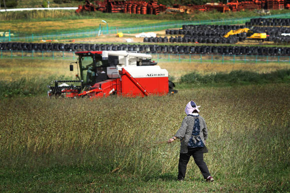 그의 화면엔 아름다운 벚꽃이 흐드러지게 피어 있고, 해바라기도 하늘을 향해 활짝 고개를 들고 있으며 이제 막 수확한 탐스러운 감들이 지천에 널려 있다. 너무도 평화로워 보이는 풍경이지만 작가의 설명을 들으면 이야기가 달라진다. 화려한 벚꽃을 심기만 해도, 해바라기를 심기함 해도, 감을 따기만 해도 정부의 보조금을 받을 수 있다는 것.