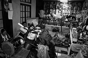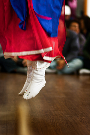 무당이 곧 신이 되고 신이 곧 무당이 된 순간, 무당의 빨강 치마와 고운 수놓인 흰 버선발이 공중으로 차오른다. 굿이 펼쳐지는 마당이다. 그 뒤로는 어슴푸레 사람들이 보인다. 징소리에 이끌려 굿판을 찍기 시작했다는 이규철은 자신에게 굿판은 사람과 사람 사이로 이어진 탯줄이라 표현한다.